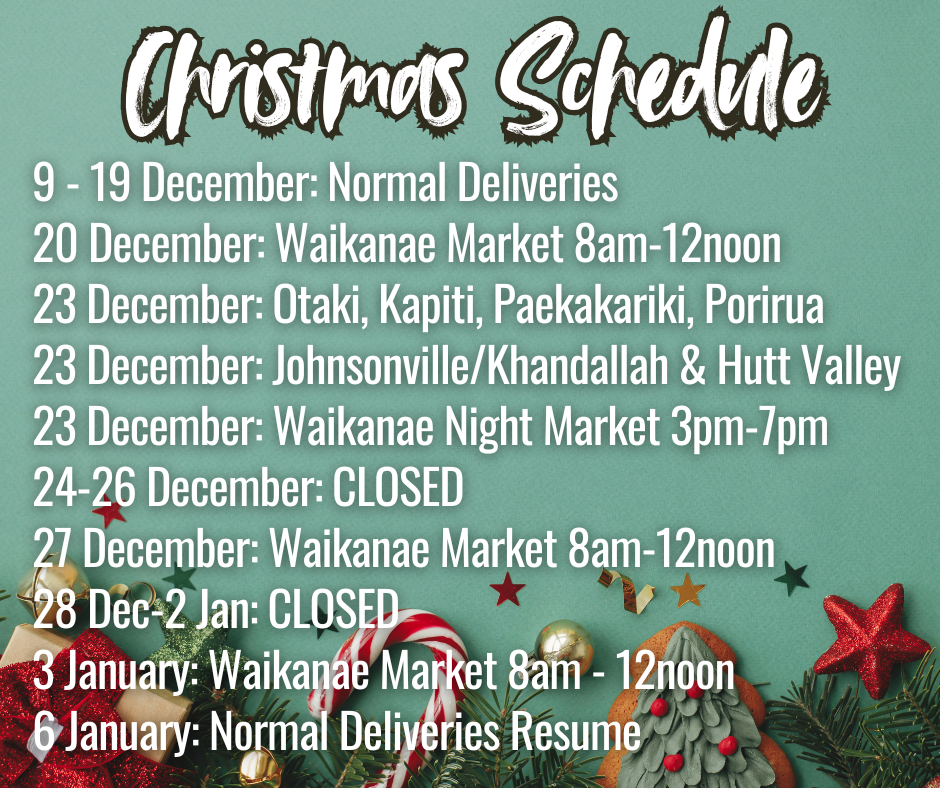Our in house delivery driver delivers to Kapiti on Wednesday, Palmerston North, Horowhenua & Feilding on Thursdays and Porirua, Wellington (Northern Suburbs), Petone & the Hutt Valley on Fridays.